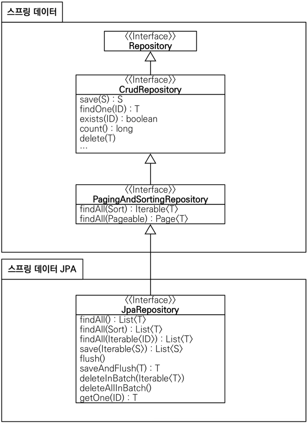 윗 부분에 스프링 데이터 모듈이 있고 그 안에 Repository, CrudRepository, PagingAndSortingRepository가 있는데 스프링 데이터 프로젝트가 공통으로 사용하는 인터페이스다.
