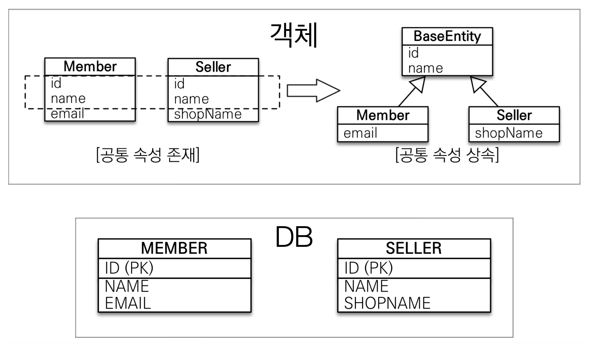 @MappedSuperclasspublic abstract class BaseEntity { @Id @GeneratedValue private Long id; private String name;}@Entitypublic class Member extends BaseEntity{ //ID, NAME μμ private String email;}@Entitypublic class Seller extends BaseEntity{ //ID, NAME μμ private String shopName;}